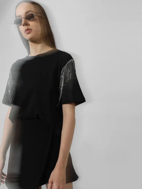 BLACK RHINESTONE DETAIL T-SHIRT